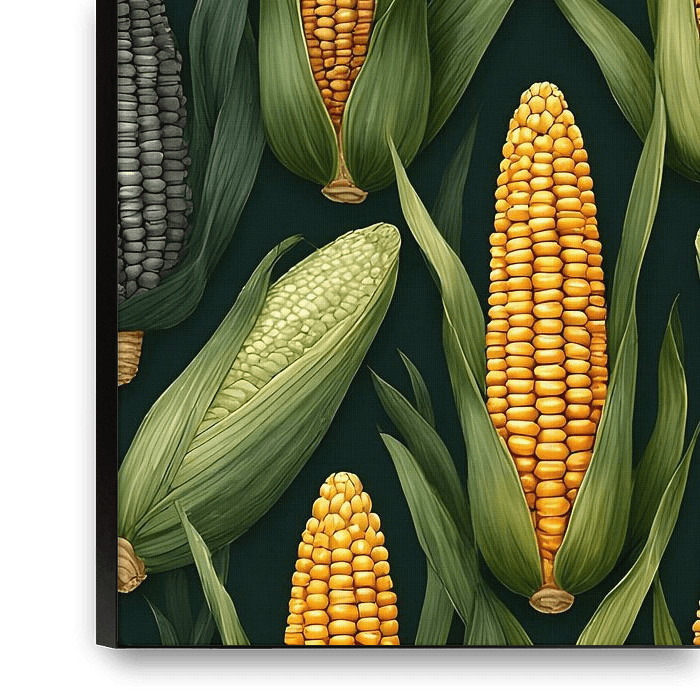 Ein lebhaftes und detailreiches, sich wiederholendes Muster von Maiskolben, die in ihre grünen Schalen eingebettet sind. Die Komposition zeigt eine auffällige Mischung aus goldgelbem Mais und kleineren, subtilen Elementen aus weißen und gräulichen Körnern, alles vor einem tiefen, dunkelgrünen Hintergrund. Der Realismus und die satten…