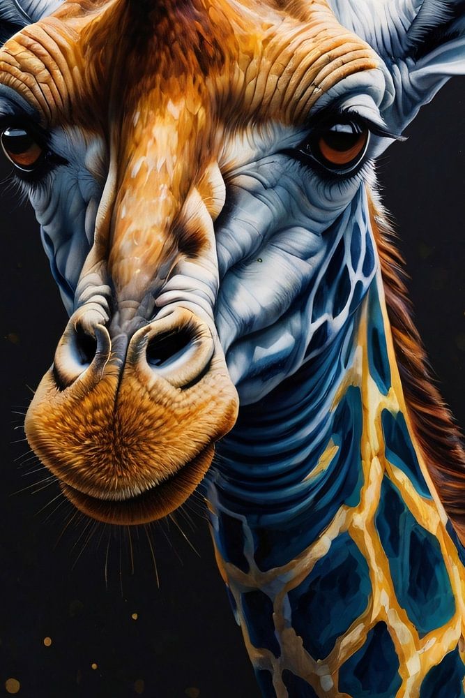 Entdecken Sie die bezaubernde Welt der Tierporträts mit unserer neuesten Ergänzung: einem farbenfrohen und detaillierten Gemälde einer Giraffe. Dieses Kunstwerk fängt den ruhigen Blick der Giraffe vor einem von funkelnden Sternen erleuchteten Nachthimmel ein und verbindet die wilde Natur mit einer kosmischen Vision. Die auffälligen blauen und orangefarbenen Muster auf der Haut der Giraffe sind mit verblüffender Präzision ausgeführt und machen das Kunstwerk zu einem Blickfang für jeden modernen Wohn- oder Arbeitsbereich. Der Künstler hat eine einzigartige Bildsprache entwickelt, die Natur und Fantasie vereint. Ideal für alle, die ihre Umgebung mit einem Hauch von Eleganz und Ungewöhnlichem bereichern möchten.
