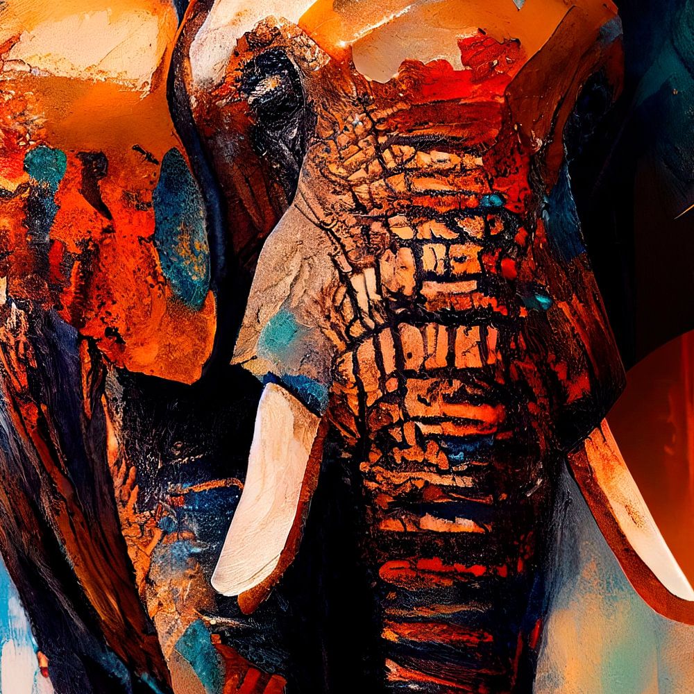 Dieses Bild zeigt einen imposanten Elefanten, der direkt auf Sie zugeht. Seine majestätische Statur füllt die Leinwand aus, und seine kräftigen Füße hinterlassen tiefe Spuren im Boden. Die groben Pinselstriche und die dicke Farbe verleihen dem Bild einen eher abstrakten Charakter. Die Textur der Pinselstriche ist deutlich sichtbar und erzeugt ein Gefühl von Bewegung und Dynamik. Es scheint, als ob der Elefant jeden Moment die Leinwand verlassen und den Raum betreten könnte. Der Elefant auf dem Gemälde hat eine beeindruckende und robuste Erscheinung, aber gleichzeitig kann man auch ein Gefühl der Ruhe und Stabilität in seiner Haltung erkennen. Das Tier scheint sich seiner Macht bewusst zu sein und macht einen selbstbewussten Eindruck. Die Kombination aus den groben Pinselstrichen, den dicken Farbschichten und dem kraftvollen Auftreten des Elefanten ergibt ein fesselndes Kunstwerk, das Sie immer wieder in seinen Bann zieht und inspiriert. Das Gemälde strahlt Kraft und natürliche Schönheit aus und lädt dazu ein, sich in die majestätische Welt des Elefanten zu versetzen.