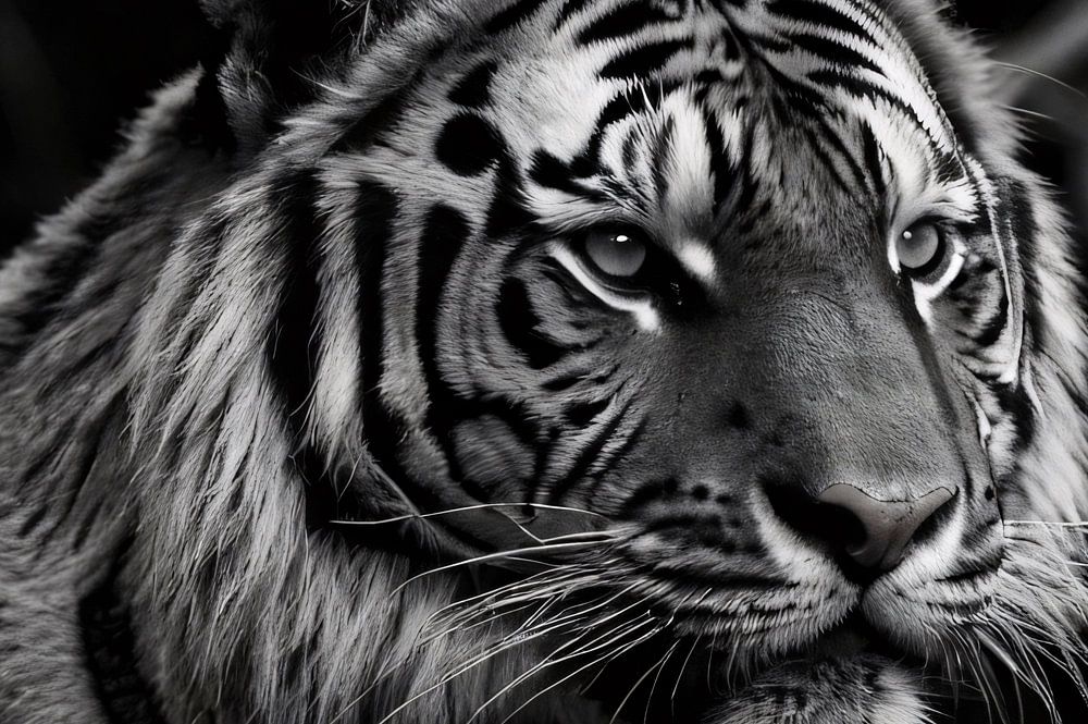 Dieses Schwarz-Weiß-Foto fängt die intensive Kraft und Schönheit eines Tigers in seinem natürlichen Lebensraum ein. Die Details des Tigers heben sich wunderschön ab, mit scharfen Linien, die den Fokus auf seine anmutige Form und seine auffälligen Streifen lenken. Der Hintergrund ist unscharf, so dass die ganze Aufmerksamkeit auf das majestätische Tier gerichtet ist. Perfekt für alle, die die Natur, die Tierwelt und die Fotografie mit einem zeitlosen, eleganten Look lieben. Dieses Design passt gut in moderne oder klassische Innenräume und verleiht jedem Raum einen Hauch von Ruhe und Stärke. Die gedämpfte Farbgebung macht es vielseitig und stilvoll, ideal für Büros oder Schlafzimmer, wo eine beruhigende und kraftvolle Atmosphäre gewünscht wird.