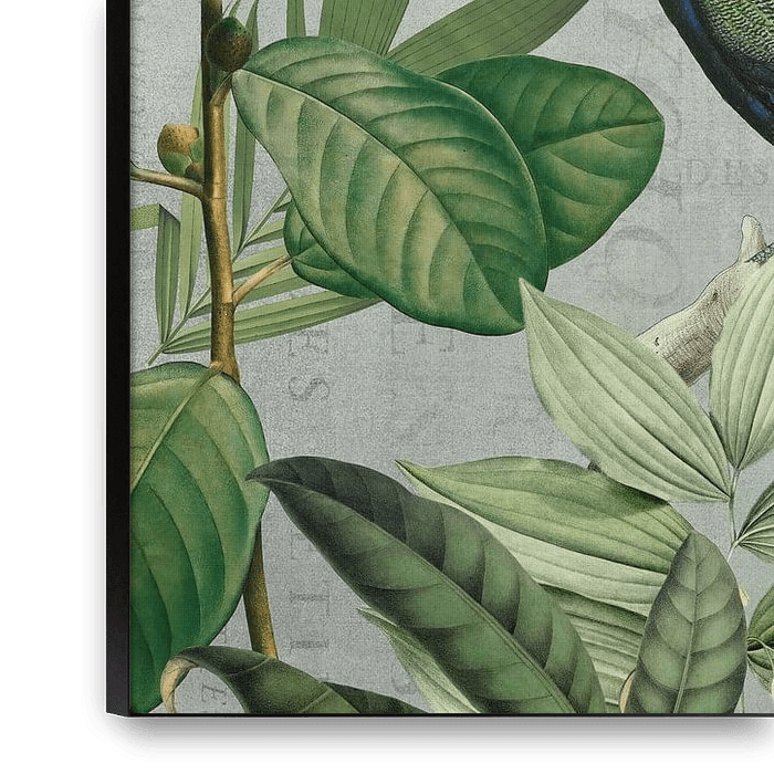 Fantasievolle und verspielte botanische Vintage-Illustration mit wunderschönen majestätischen Pfauen. Egal, ob Sie ein Statement abgeben oder einfach etwas Besonderes in Ihr Zuhause bringen wollen, dieses Wandbild ist die perfekte Wahl für alle, die die exotische Stimmung und die tropische Dschungelatmosphäre lieben
