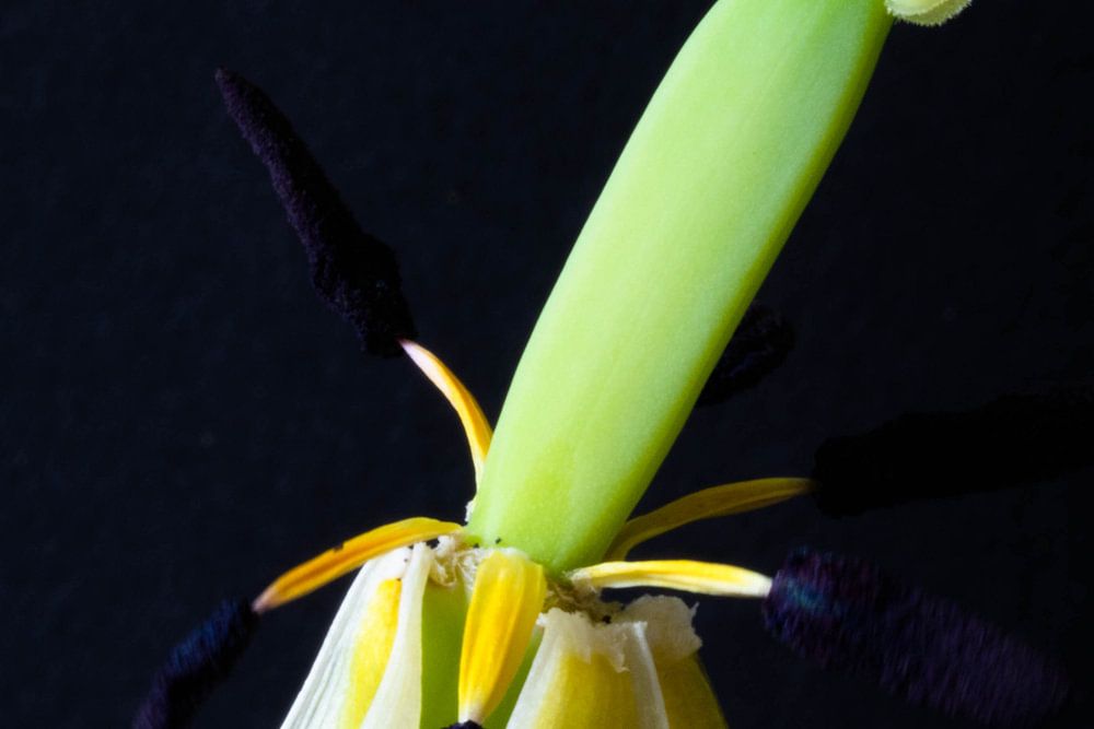 Makro-Aufnahme einer Effloreszenz-Tulpe vor schwarzem Hintergrund