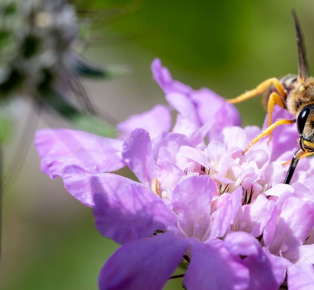 Makro von einer Biene auf einer rosa Scabiosa Blüte