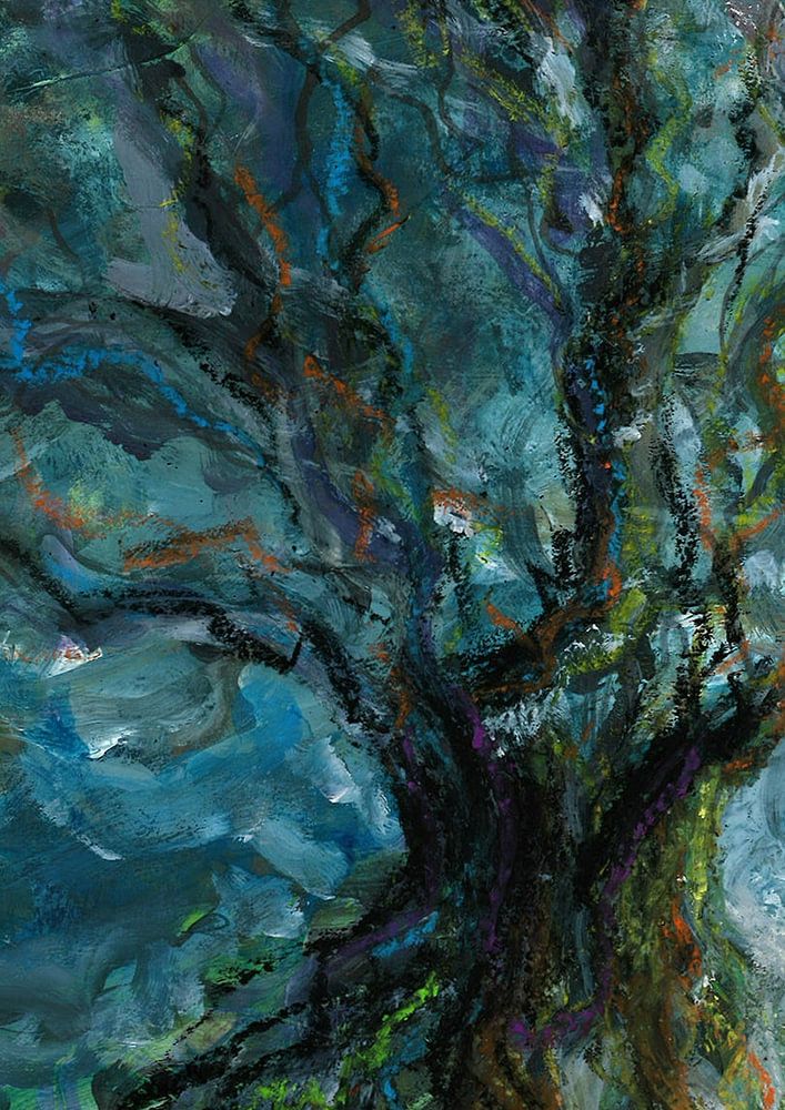 Dieses Bild eines Baumes, der abends auf einem Hügel steht, vermittelt ein natürliches Gefühl. Es passt gut in eine kühle Einrichtung. Es ist mit Acrylfarbe, Ecoline und Kreide gemalt.