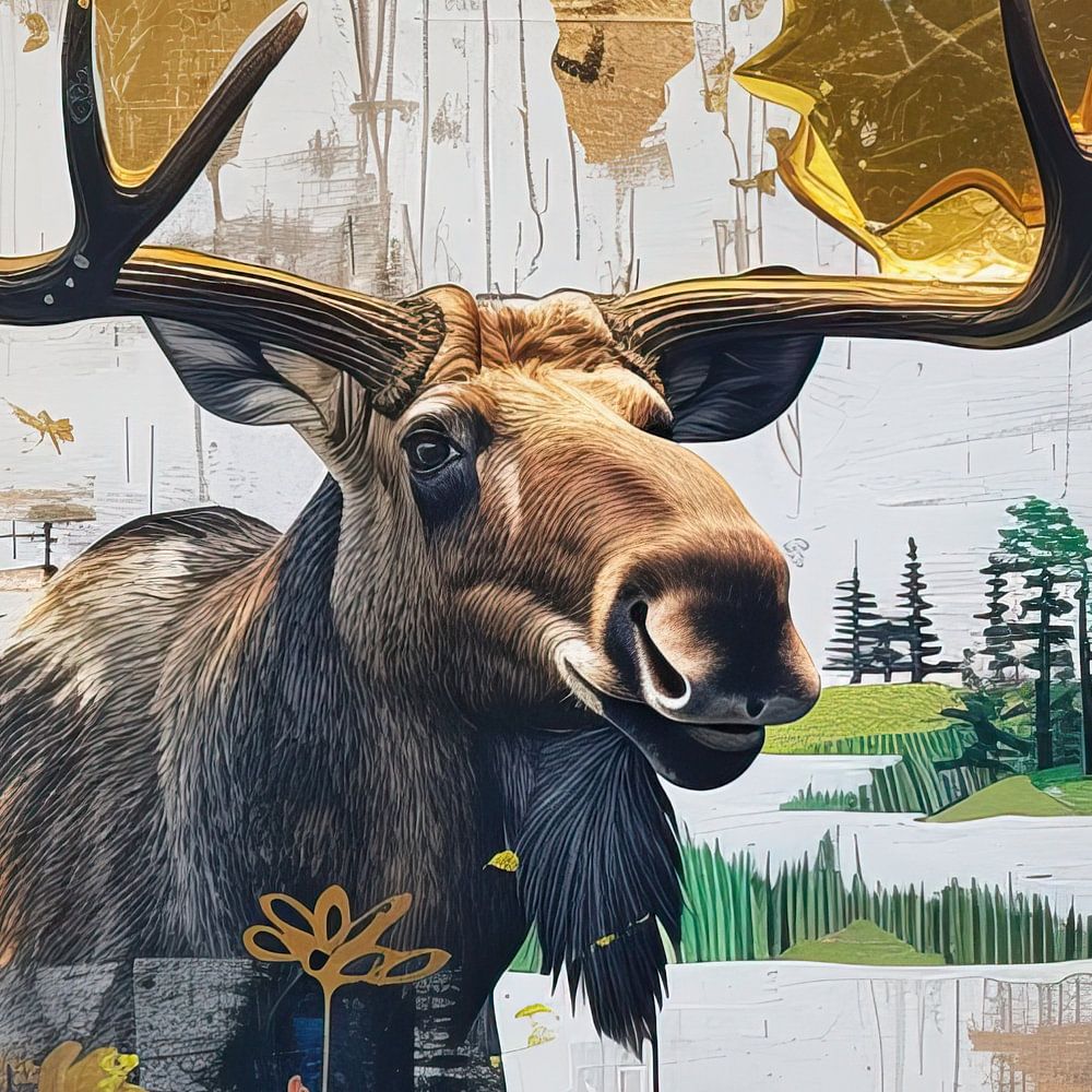 Details: Elch, Collage, Natur, Geweih, Schmetterlinge, Blumen, Bäume, Gold, Weiß, Braun