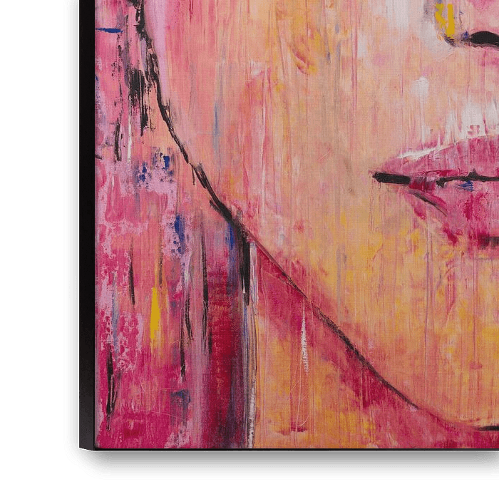 Zweifellos hat sie sich für eine subtile Mischung der Pastellfarben entschieden. Ihre weichen Lippen plätschern auf der Leinwand. Auch ihre Augen lassen einen nicht mehr los. Es ist eine Leinwand, die weiterhin fasziniert, schön als Kontrast in einem zeitgenössischen Interieur.