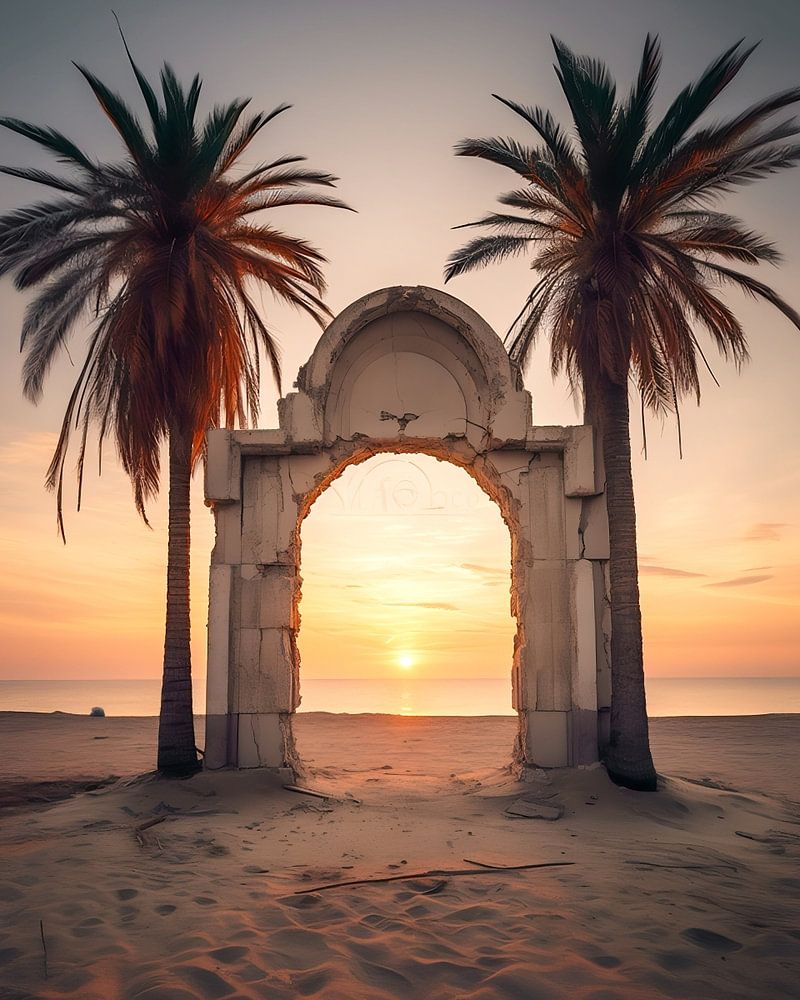 Romantische Stimmung am Strand beim Sonnenaufgang unter Palmen