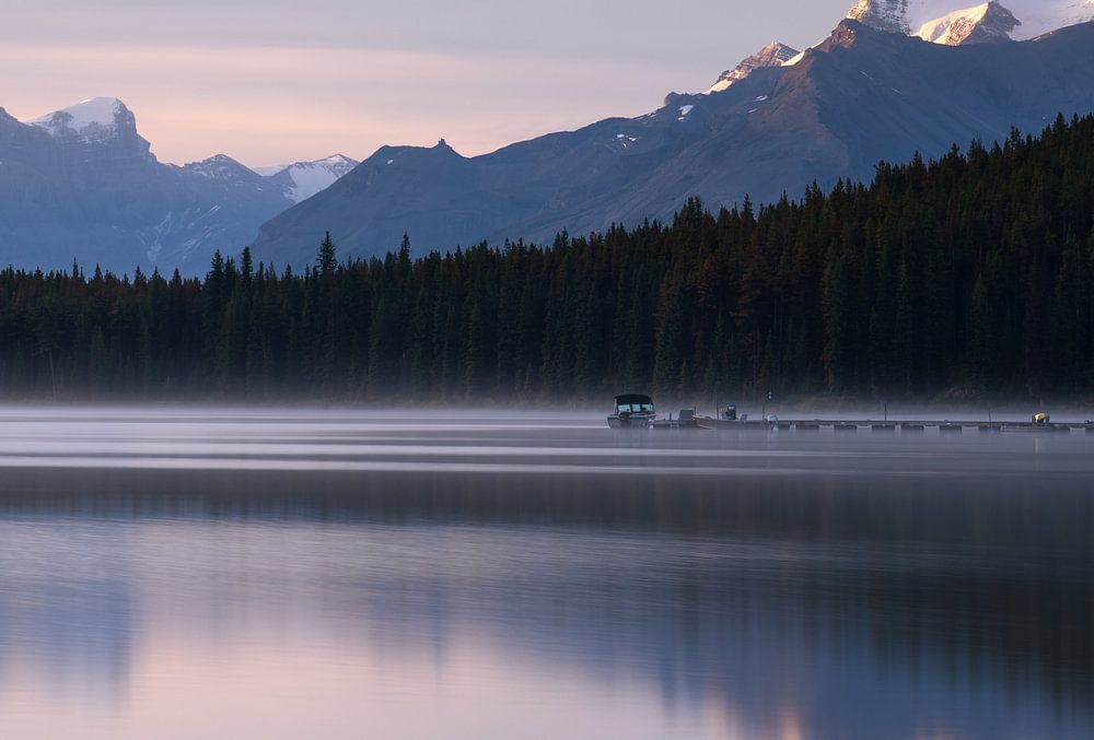 Tagesanbruch am Maligne Lake im Jasper National Park, Bundesstaat Alberta, Kanada