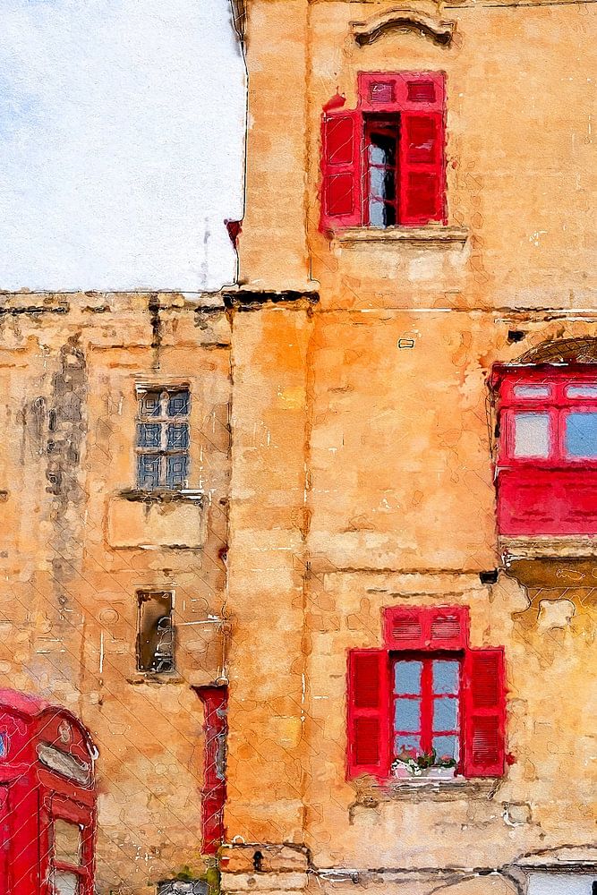 Bestelle das digitale Kunst Bild Malta Valetta Stadt Aquarellmalerei #malta von JBJart Justyna Jaszke als Reproduktion auf Leinwand, Alu-Dibond, als Poster, Fototapete oder Acrylglasbild.