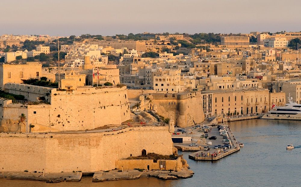 Valletta Malta Blick über den Grand Harbour auf Vittoriosa und Fort St. Angelo von den Upper Barrakka Gardens.