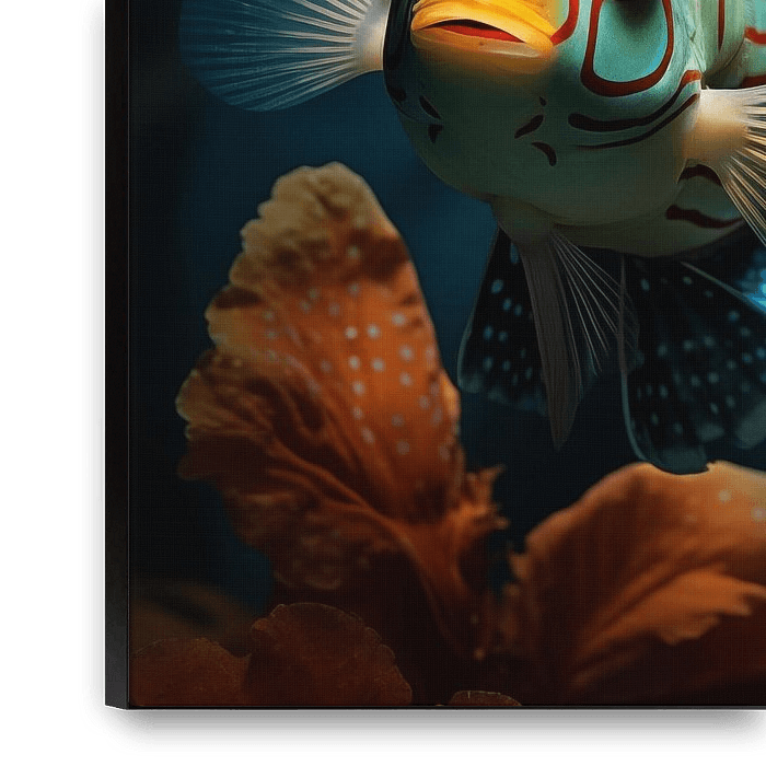 Ein farbenfrohes Mandarinfisch-Gemälde mit einem schönen und einzigartigen Stil. Mit schönen Farbtönen und einem einzigartigen Design ist dies ein stilvoller Fotodruck, der in jedem Raum gut aussieht. 100% einzigartig und originell!