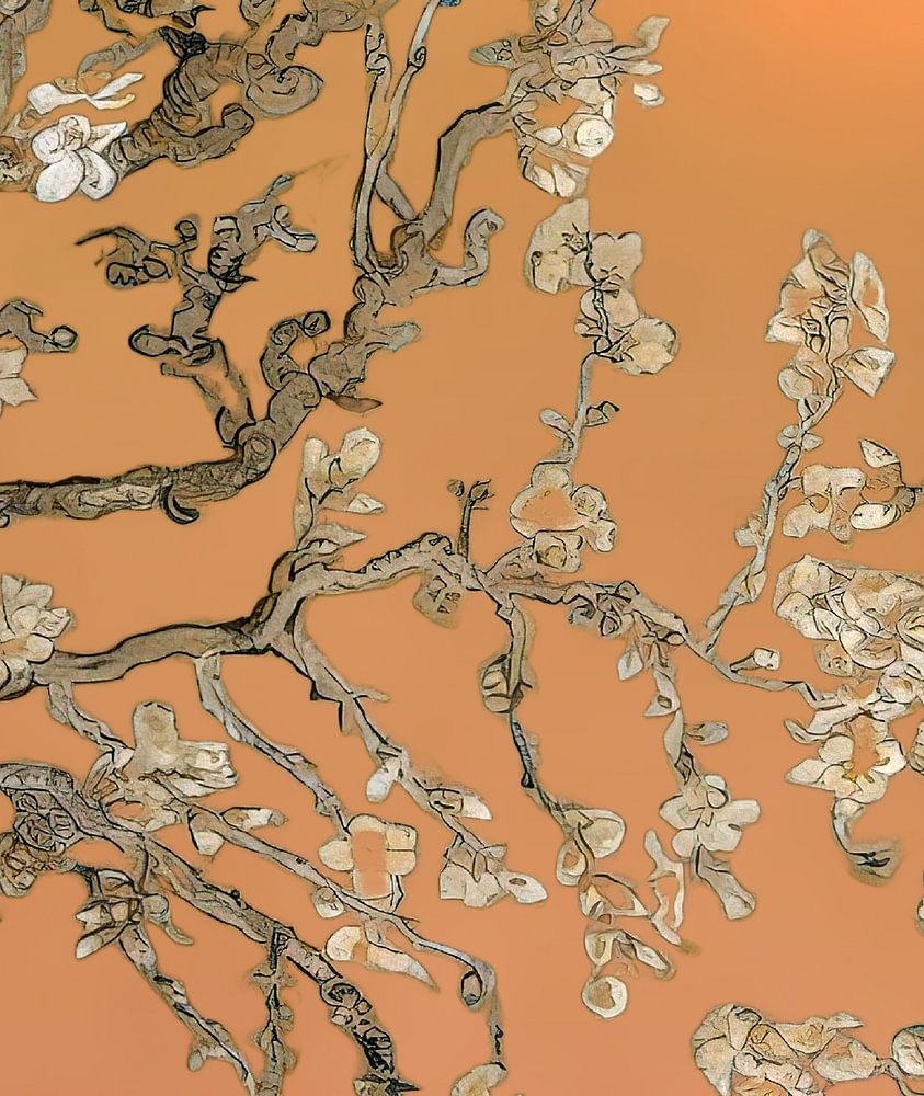 Dieses Kunstwerk zeigt ein verziertes Bild einer Mandelblüte vor einem warmen, erdfarbenen Hintergrund. Die detaillierten Zweige und zarten weißen Blüten scheinen vom Stil Vincent van Goghs inspiriert zu sein, mit einer organischen, fast gezeichneten Textur. Die weichen Farbtöne und verspielten Linien wirken beruhigend und elegant, während die Blüten Erneuerung und Frühling symbolisieren.