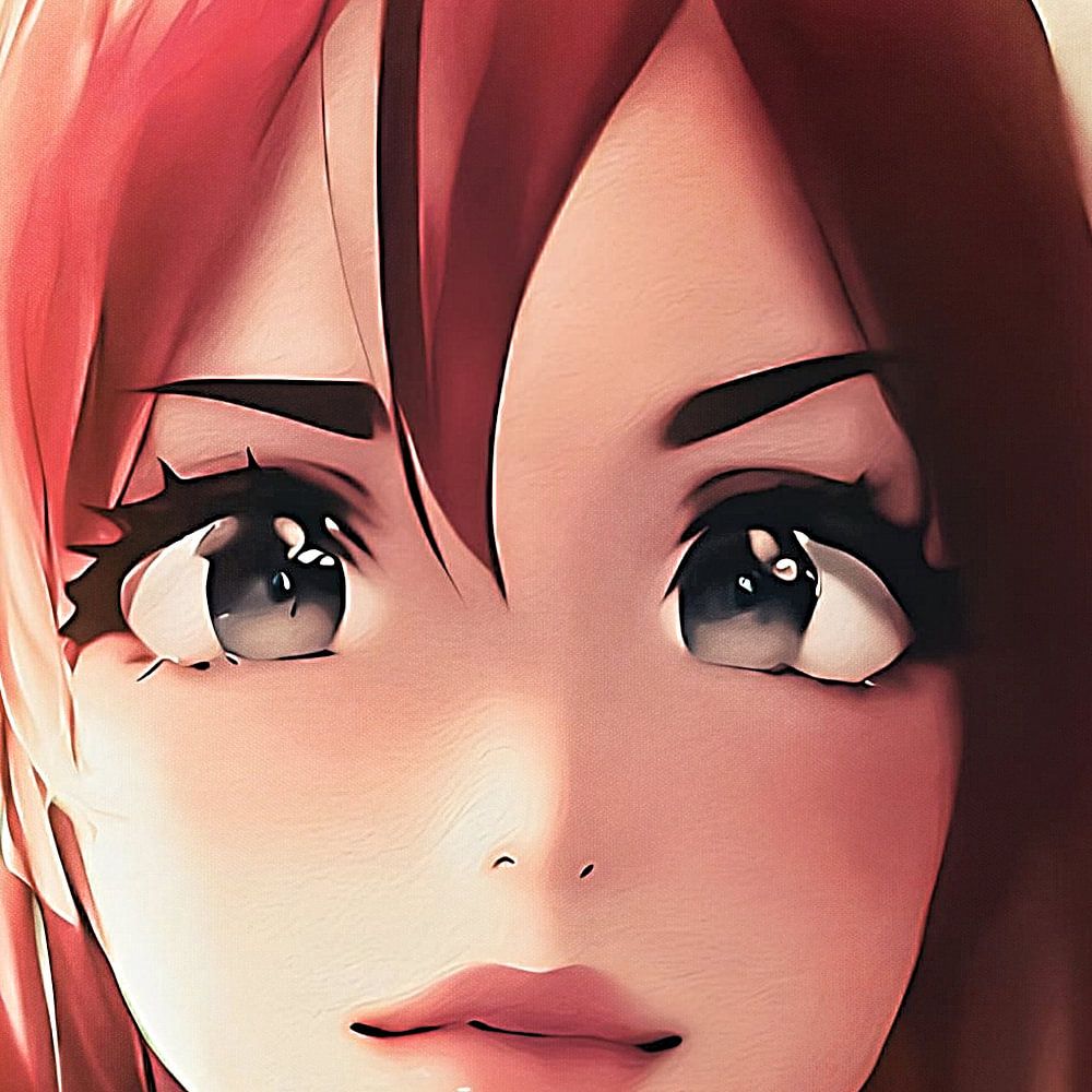 Quadratisches Kunstwerk eines Mädchens mit roten Haaren. Mischung aus realistischem und Anime/Manga-Stil. Das Mädchen blinzelt leicht, schaut aber direkt in die Linse.