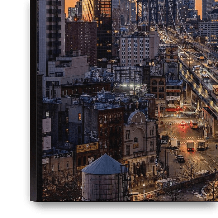 Ein Blick auf die Manhattan Bridge zur blauen Stunde - aufgenommen von Chinatown mit Brooklyn im Hintergrund. Der pulsierende Verkehr auf der Brücke, die beleuchteten Straßen von Chinatown und die sanfte Dämmerung verleihen der Szene eine einzigartige Dynamik. Ein Moment, der das urbane Leben und die architektonische Schönheit New Yorks…