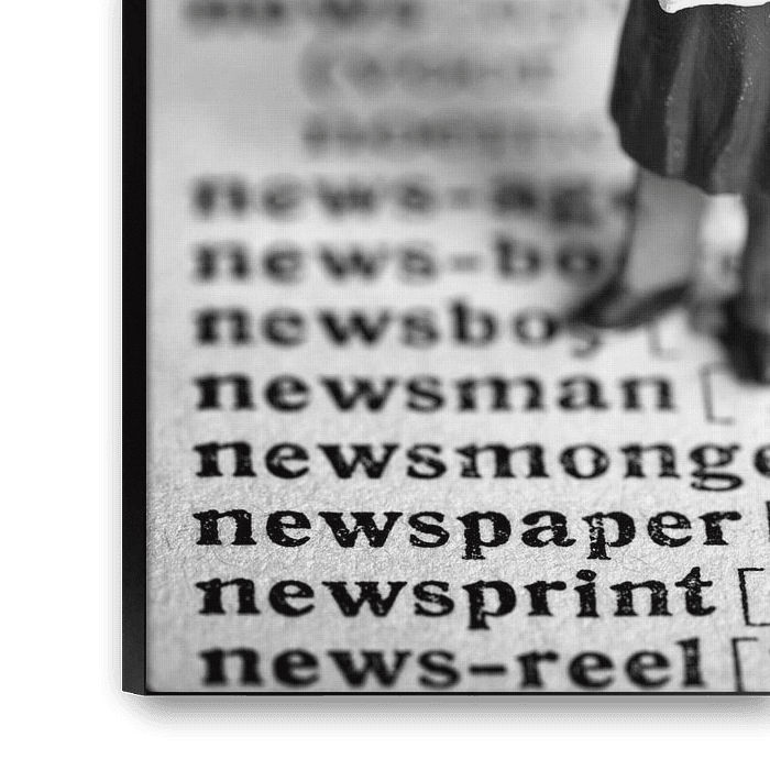 Ein Mann liest die Zeitung. Er ist in einem alten Englisch-Niederländisch-Wörterbuch mit dem englischen Wort 'newsman'. Diese kleinen Figuren sind etwa zwei Zentimeter hoch und werden oft im Modellbau oder bei der Modelleisenbahn verwendet. Die Puppen haben einen Maßstab von 1:87 und sind daher in der Fotografie leicht zu verwenden. Sie erzeugt oft ein lustiges oder befremdliches Bild. Diese Form der Fotografie fällt in den Bereich der Makrofotografie, wird aber oft auch als Miniaturfotografie bezeichnet.