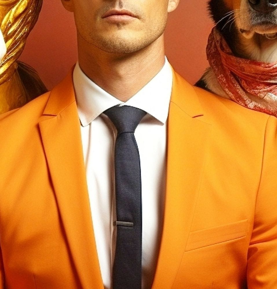 Ein Mann in einem leuchtend orangefarbenen Anzug mit einer dunklen Krawatte sitzt selbstbewusst zwischen zwei Hunden. Der linke Hund ist golden mit großen, roten Augen und weißen Akzenten. Der rechte, ein schwarz-braun-weißer Hund, trägt ein gemustertes, rotes Halstuch. Der Hintergrund ist ein warmer, gedeckter Rotton. Die Komposition wirkt stilisiert und leicht surreal, eine ungewöhnliche Gruppierung, die die Persönlichkeiten von Mensch und Tier in den Vordergrund stellt. Der direkte Blick des Mannes und der Hunde erzeugt eine faszinierende Präsenz.
