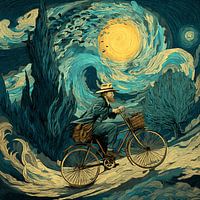Bestelle diese Malerei Mann radelt durch den Sternenhimmel von Aden Pink Studio als Reproduktion auf Leinwand, Alu-Dibond, als Poster, Fototapete oder Acrylglasbild.