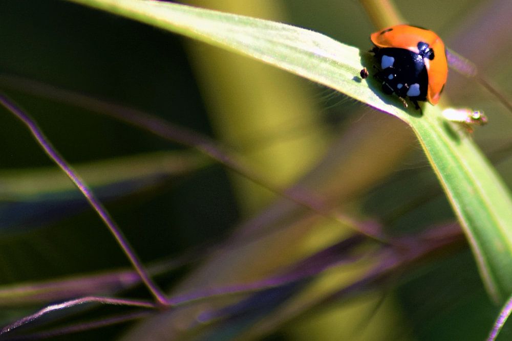 Dieser Marienkäfer schaut von seinem Blatt in einer abstrakten Landschaft aus Zweigen und Blättern direkt in die Kamera.