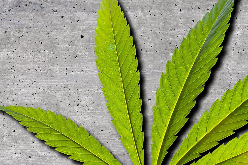 Marihuana, Cannabis, Hanf - grünes Blatt auf grauer Betonwand