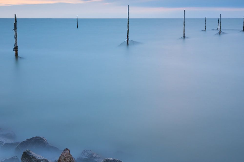 Der Markermeer-See, fotografiert mit dem Big Stopper, also einer langen Verschlusszeit, die das Wasser schön bläulich und glatt erscheinen lässt. Der Markermeer-See bei Sonnenuntergang mit einer langen Belichtung.