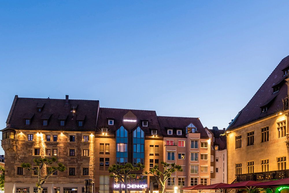 Marktplatz mit der Kaiserstraße, dem Kätchenhaus, dem Kätchenhof und dem Rathaus am Abend in Heilbronn, Baden-Württemberg, Deutschland