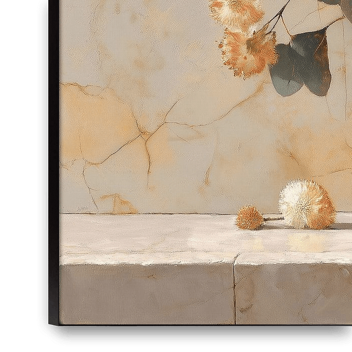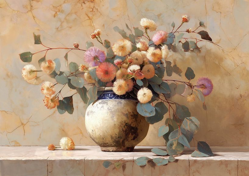 Marmorvase PomPoms – Dieses Blumenbild zeigt ein Japandi-Stillleben mit einer antik anmutenden Keramikvase voller flauschiger, pomponartigen Blumen und breiten Eukalyptusblättern, gemalt in sanften marmorartigen Beige- und Terrakottatönen mit subtilen Akzenten in Rosa, Gelb und Blau und einer realistischen, leicht pudrigen Textur – ein…
