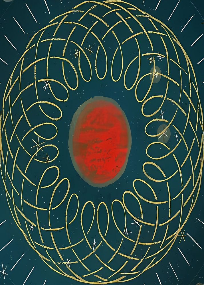 Das Bild zeigt eine stilisierte Illustration des Planeten Mars vor einem dunkelblauen Hintergrund. Der Planet wird durch einen roten Kreis dargestellt, der von einem goldenen, verschlungenen, kreisförmigen Muster umgeben ist, das an ein gewebtes Netz erinnert. Der Hintergrund ist mit zahlreichen kleinen, weißen und goldenen Sternen übersät, die eine himmlische Atmosphäre schaffen.