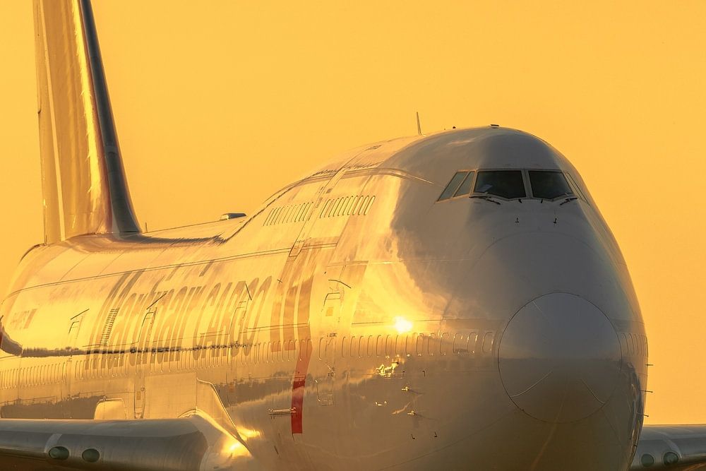 Der Martinair 747 "Jumbo", fotografiert mit der untergehenden Sonne im Hintergrund.