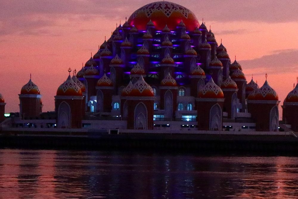 Während des Sonnenuntergangs wurden wir mit einem wunderschön gefärbten Himmel und leuchtend farbigem Wasser verwöhnt. Die Moschee spiegelt sich im Wasser.