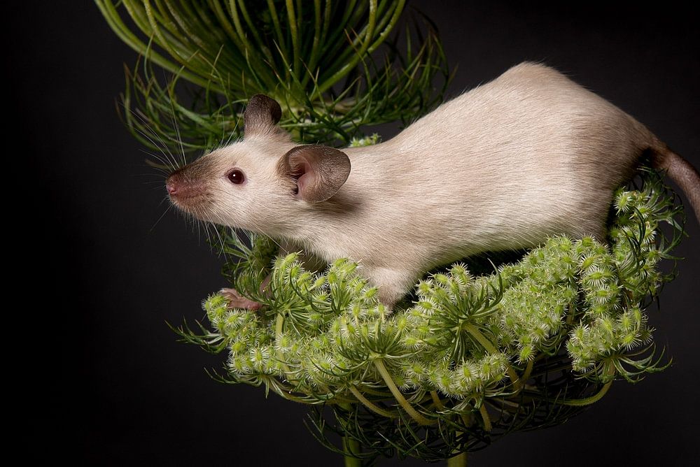 Siegelpunktmaus auf wilder Karotte vor schwarzem Hintergrund
