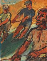 Een dynamisch, expressief groepportret van drie vissers in actie op een strand of duinachtig terrein. De centrale figuur trekt met kracht aan een net of touw, armen gespannen en lichaam gebogen; links een staande visser met pet en shirt, rechts een oudere man met opengesperde mond (mogelijk schreeuwend of zingend) en rode gezichtstint.…