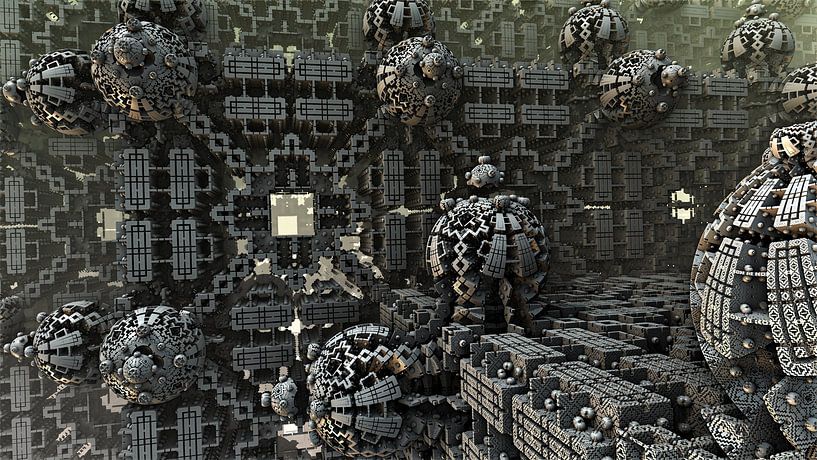 Dieses digitale Kunstwerk basiert auf der Generierung komplexer 3D-Fraktale und wurde mit der Software Mandelbulb 3D erschaffen. Es zeigt eine vielschichtige, nahezu endlose Struktur, in der sich kugelförmige Fraktalobjekte und streng geometrische Bauelemente zu einer monumentalen, maschinenartigen Landschaft verbinden. Charakteristisch…
