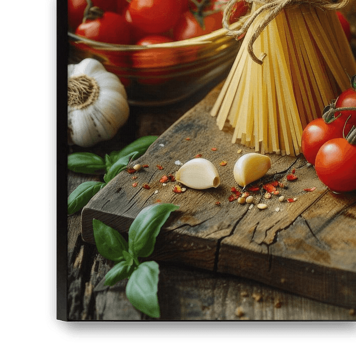 Dieses detailreiche Stillleben zeigt ein Bündel Spaghetti auf einem rustikalen Schneidebrett, umgeben von frischen Zutaten wie Tomaten, Basilikum und Knoblauch. Die sorgfältige Anordnung und die natürlichen Farben machen dieses Bild zu einem perfekten Dekorationsstück für Küchen und Esszimmer. Ideal für Feinschmecker und Liebhaber der mediterranen Küche, die ihre Räume mit einem Hauch von kulinarischer Kunst bereichern möchten.