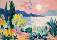 Eine expressive Küstenlandschaft am Mittelmeer. Vor einem leuchtend rosa Himmel steht die tief hängende Sonne über einer ruhigen Bucht. Im Vordergrund prägen dunkle Zypressen, gelb leuchtende Baumkronen und blaugrüne Agaven die Szenerie. Die fernen Berge schimmern in kühlen Blautönen, während das Wasser das helle Licht reflektiert.…