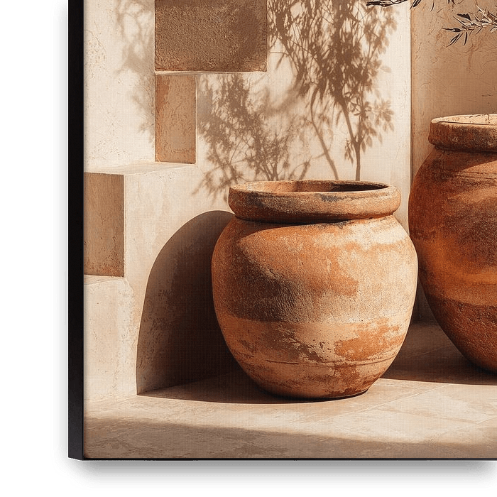 Bestelle das digitale Kunst Bild Mediterrane Terrakotta-Töpfe mit Olivenbaum in sanftem Sonnenlicht von But First Framing als Reproduktion auf Leinwand, Alu-Dibond, als Poster, Fototapete oder Acrylglasbild.