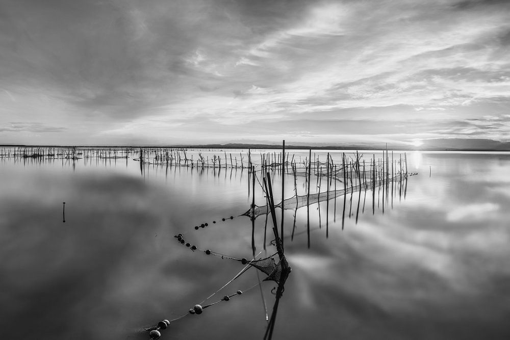 Sonnenuntergang am See / Lagune bei Valencia / Albufera / Spanien. Schwarzweiss fineart 90320377ays
