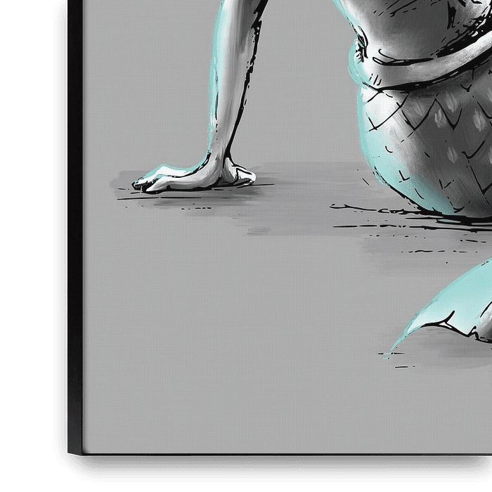 Kunstwerk einer Meerjungfrau in Grautönen. Diese Meerjungfrau liegt am Strand und scheint die Sonne zu genießen. Dieses Werk wurde auf der Grundlage einer handgezeichneten Bleistiftzeichnung digital koloriert.