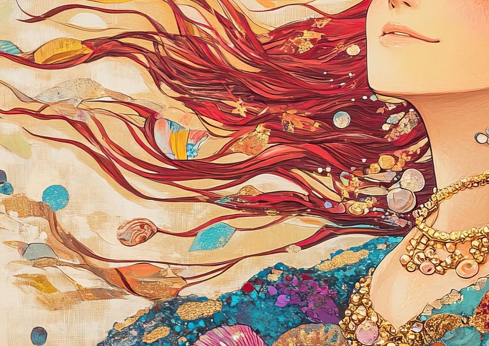 Details: Frauenbild, moderne Kunst, natürliche Schönheit, rotes Haar, Muscheln, Juwelen, heiterer Blick, farbenfroh, Meereselemente, friedliches Portrait