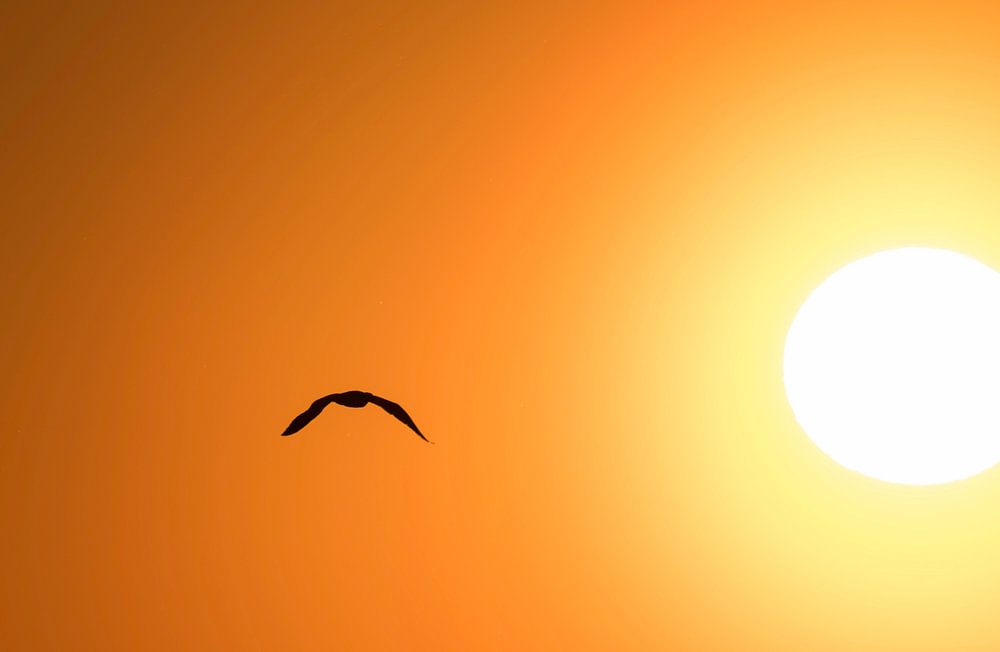 Een zeemeeuw die tegen de ondergaande zon over de zee heen vliegt met op de achtergrond een vrachtschip.