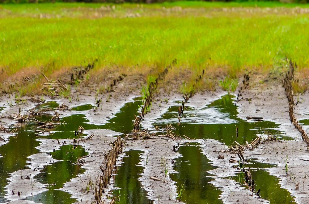Eine etwas zenartige, fast abstrakte Komposition mit Wasser, Grün, Reflexionen und skurrilen Mustern. Nach einem nassen Winter und einem ebenso nassen Frühjahr steht auf diesem Feld, auf dem im Sommer zuvor Mais angebaut wurde, immer noch viel Wasser. Wie langgestreckte Seen folgt das Wasser den Konturlinien der Furchen zwischen den Maisstümpfen. Und der Wald im Hintergrund spiegelt sich in dem nassen Boden.