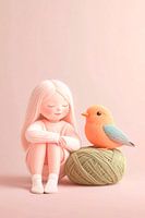 Ein kleines Mädchen, das einen gestrickten Pullover aus weicher Wolle und weiche Wollsocken trägt, hat ein Wollknäuel mit einem orangefarbenen Vogel neben sich, der ebenfalls aus Wolle zu sein scheint. Das Ganze fühlt sich weich und süß an. Das Bild wurde mit ai erstellt.