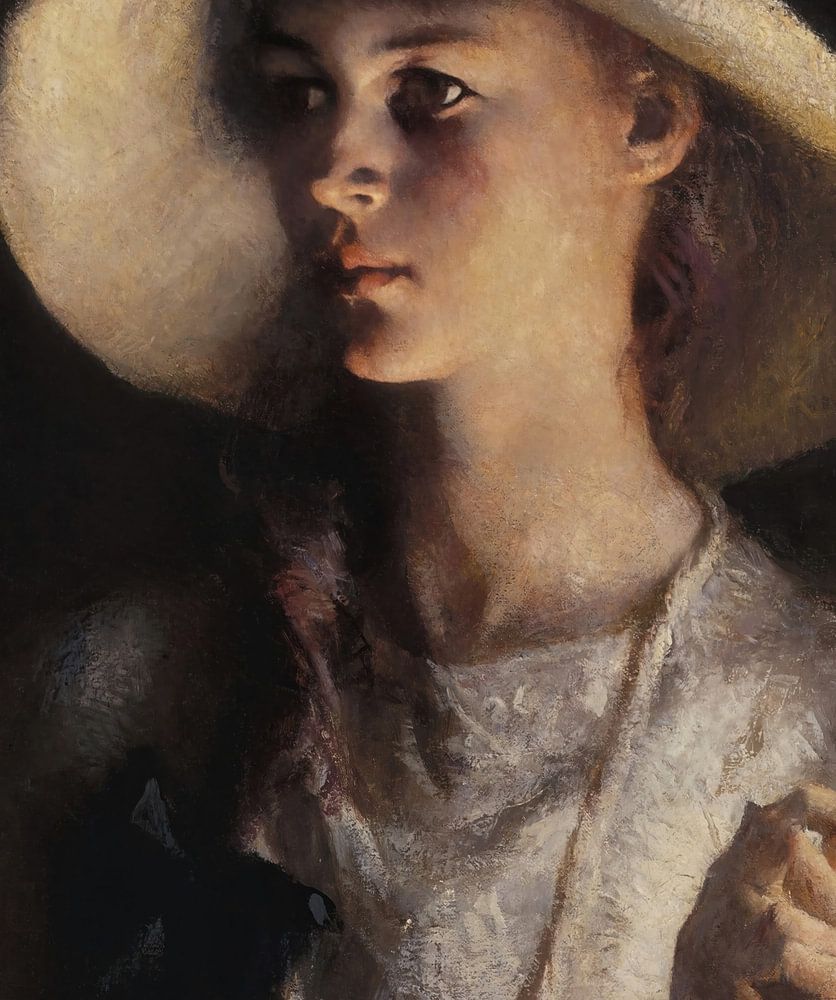 Das Gemälde zeigt die eigene Tochter des Künstlers in einer ruhigen Umgebung im Freien, umgeben von üppigem Laub und in sanftes Sonnenlicht getaucht. Bensons geschickte Pinselführung und seine subtile Farbpalette schaffen eine harmonische und friedliche Atmosphäre. Der ruhige Gesichtsausdruck und die entspannte Körperhaltung des Mädchens vermitteln ein Gefühl von Unschuld und Zufriedenheit. Mit seiner scharfen Beobachtung und künstlerischen Meisterschaft vermittelt Benson die tiefe Bindung zwischen Eltern und Kind und verewigt einen Moment der Liebe und Verbundenheit.