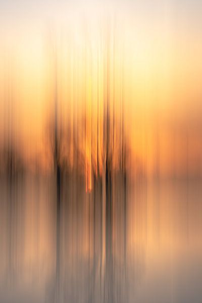 ICM oder absichtliche Kamerabewegung von einigen Bäumen im Auenpark Meinerswijk in Arnheim, Gelderland. Die Sonne geht auf und färbt den Himmel in ein schönes Orange.