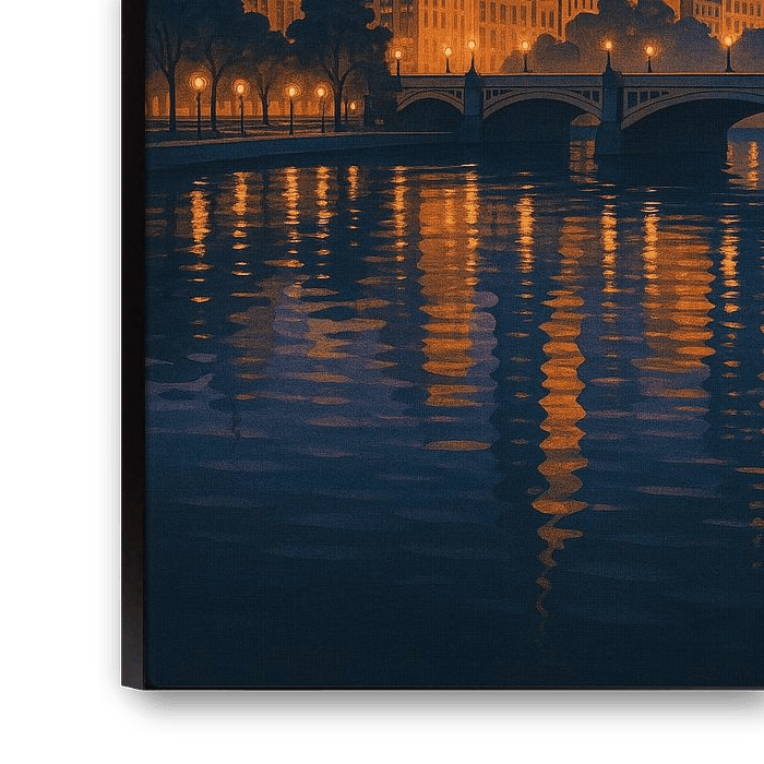 Die reiche abendliche Farbpalette schafft ein Gefühl von Ruhe und stiller Schönheit. Die Gebäude sind mit klaren geometrischen Schatten dargestellt, was dem Werk einen zeitlosen architektonischen Reiz verleiht. Der Himmel hinter den Türmen geht in sanfte Farbverläufe über und lässt die Skyline gleichzeitig mächtig und friedlich erscheinen. Das sanfte Plätschern des Flusses verstärkt die Stimmung und macht die Szene zu einer ruhigen Flucht aus dem geschäftigen Stadtleben.