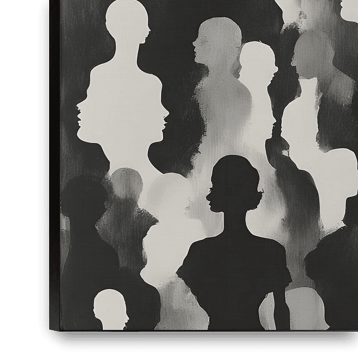 Dieses eindrucksvolle Werk zeigt eine dichte und dynamische Menge menschlicher Silhouetten. Durch die Verwendung einer kontrastreichen Palette von Schwarz, Weiß und verschiedenen Grautönen erzeugt das Kunstwerk eine fesselnde visuelle Textur. Die Figuren überschneiden sich und treten zurück, so dass der Eindruck einer geschäftigen…