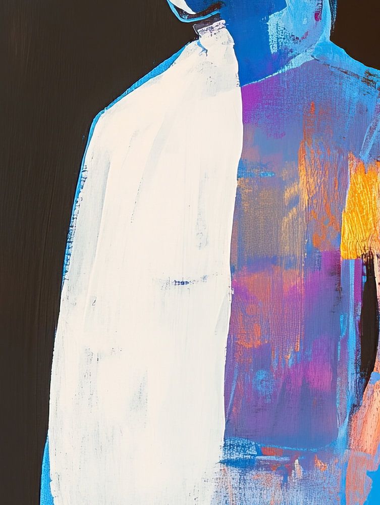 Menschliche Figur | Anonymer Blick - Dieses abstrakte Gemälde einer menschlichen Figur zeigt die Silhouette einer Person ohne Gesichtsdetails vor einem dunklen Hintergrund mit einem lebhaften Farbspiel aus Blau, Weiß und Orange.