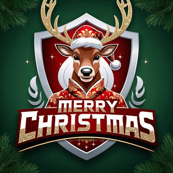 Serie XMAS - Merry Christmas Rentier - Schönes Weihnachtbild eines Rentiers in Damast in den Farben Tannengrün und Rot, mit Tannenzweige. Das Bild symbolisiert "friedliche" Weihnachten und Respekt vor allen Lebewesen.