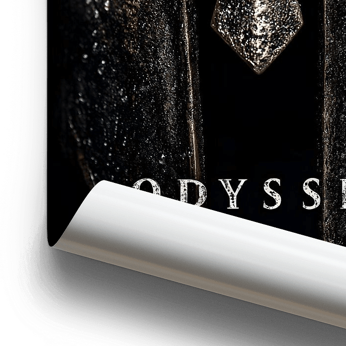 Zu sehen ist eine extreme Nahaufnahme eines antiken Helms, vermutlich in spartanischer Form. Die Oberfläche aus dunklem, oxidiertem Metall ist von Kratzern, Kerben und Wassertropfen übersät. Die schmalen Sehschlitze liegen tief im Schatten, sodass das Innere vollständig schwarz erscheint. Unterhalb des Helms steht in klar gesetzten…