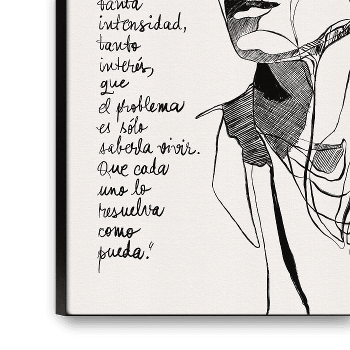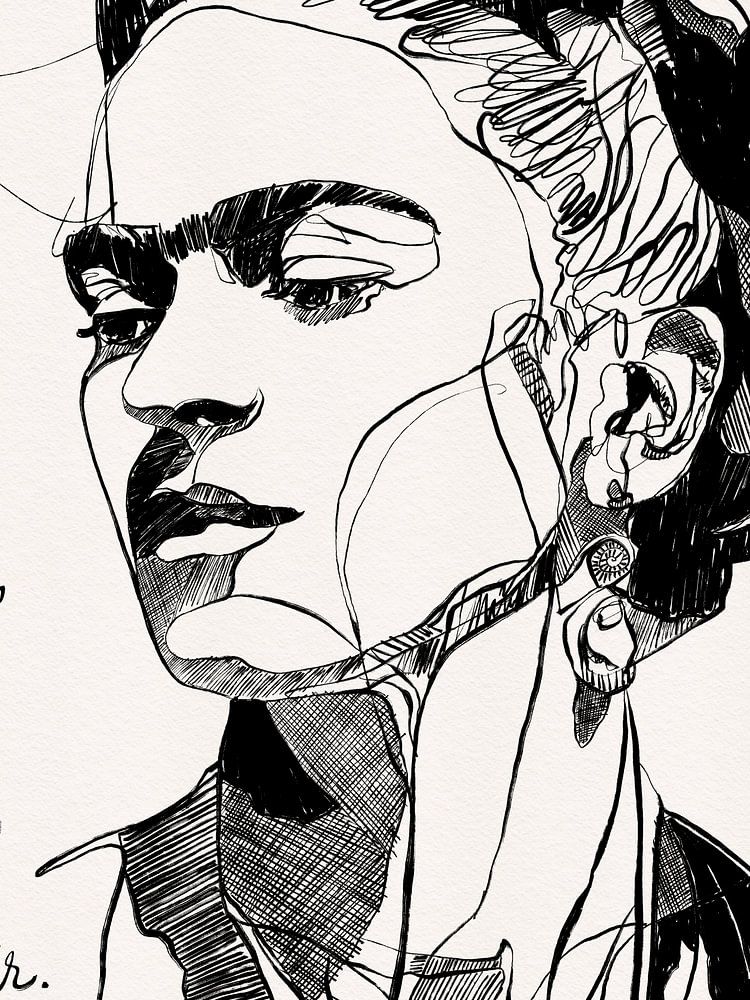 Ein minimalistisches Strichporträt der mexikanischen Malerin, begleitet von ihrem nachdenklichen handschriftlichen Zitat über Zeit und Leben. Das Kunstwerk verbindet ausdrucksstarke Tuschestriche mit emotionaler Tiefe und symbolisiert Stärke, Schmerz und Schönheit. Das Zitat lautet: "Jeder Tick-Tack ist ein Herzschlag des Lebens, der vergeht -