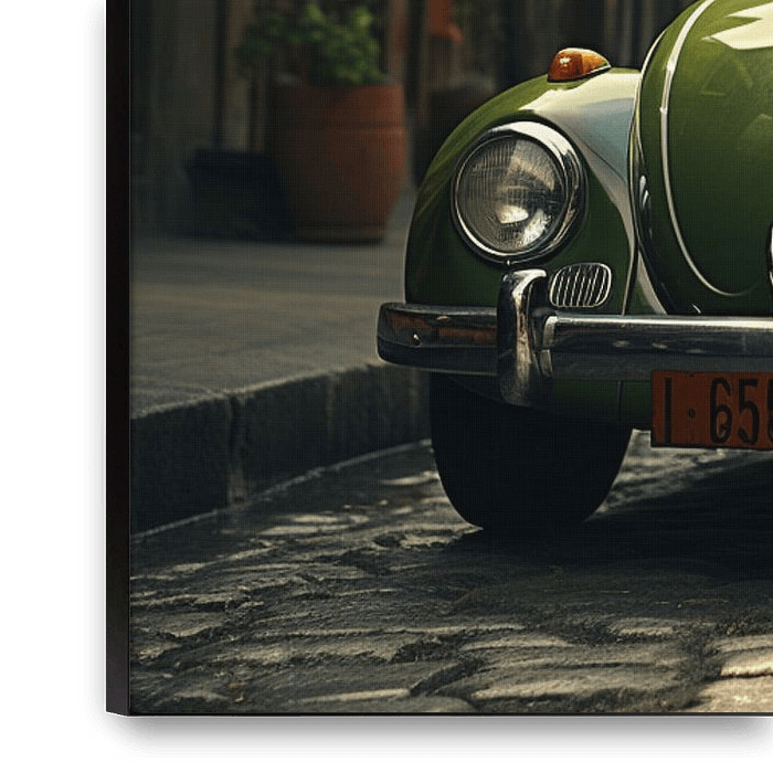 Ein alter grüner Volkswagen Käfer in einer typischen mexikanischen Straße. Umgeben von bunten Kolonialfassaden strahlt er Nostalgie aus.